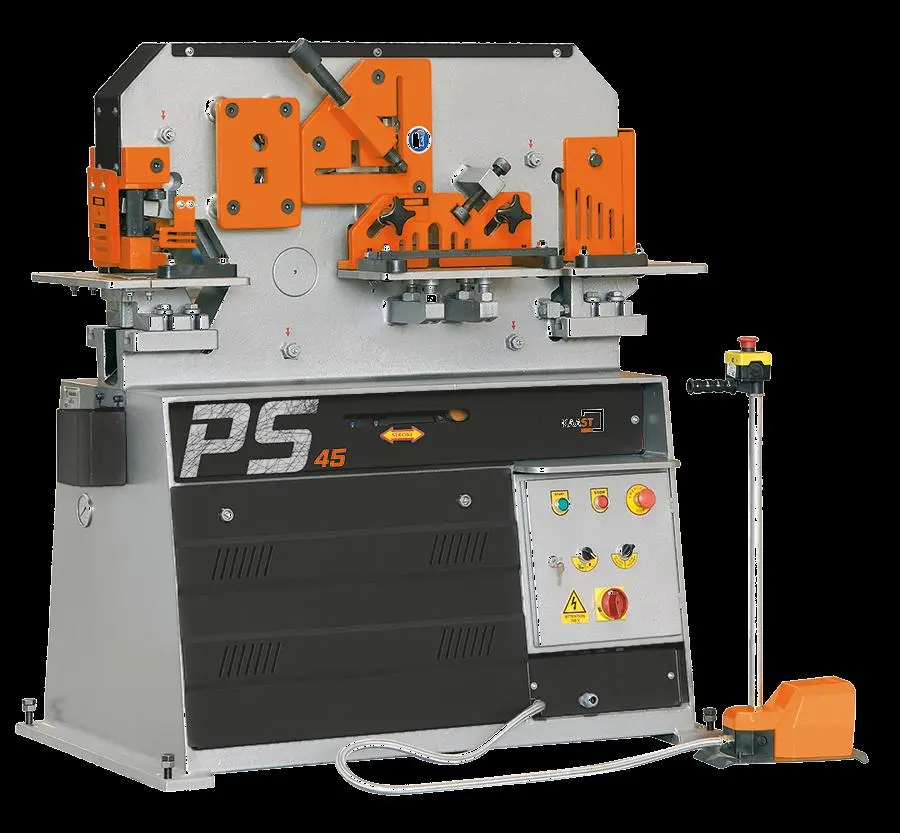 KAAST's PS model is a multi-purpose iron worker machine equipped with five workstations catering to punching, shearing, steel working, and notching needs. The PS DP hydraulic Ironworker model, distinguished by its dual-cylinders configuration, thus allowing facilitates simultaneous parallel work on both the punch as well as a second workstation.