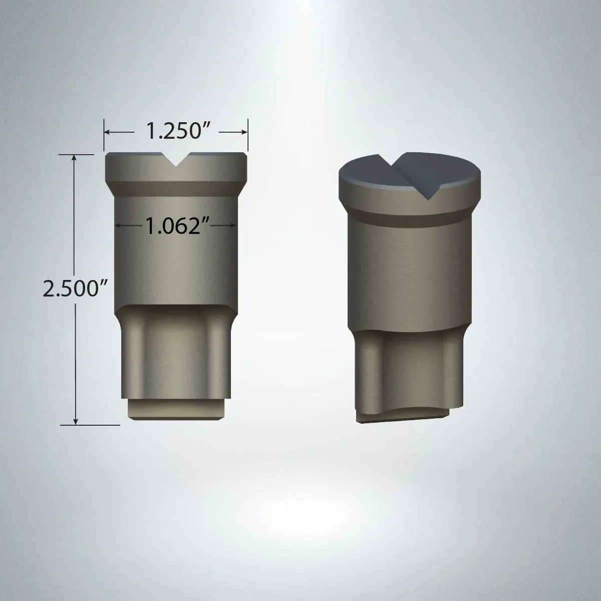 Punches are supplied with a single v-groove. Use 1/8" Round x 1" Long Keystock to align punches in the machine. All sizes listed ship within 24 hours. Contact us for custom sizes not listed. Commonly paired with F55 Corner Radius Dies.