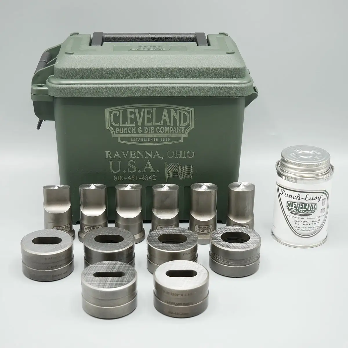 Punch & Die Sets are a great way to stock your punch and die inventory. This Set is in stock and includes 6 F16 Oblong Punches, 6 F55 Oblong Dies, Half Pint of Punch-Easy®, and Toolbox.