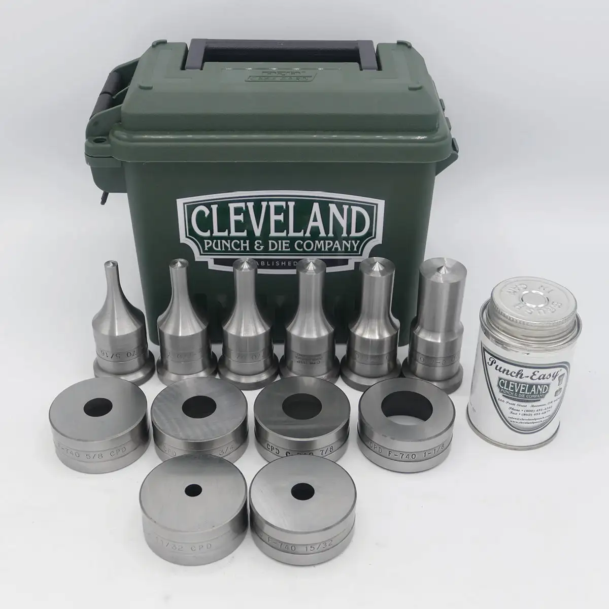 Punch & Die Sets are a great way to stock your punch and die inventory. This Set is in stock and includes 6 F770 Round Punches, 6 F740 Round Dies, Half Pint of Punch-Easy®, and Toolbox. Dies are supplied with notch.
